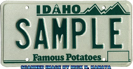 REFERENCE NUMBER: ID-1974FIRST YEAR OF ISSUE: 1974 PLATE TYPE: GENERAL ISSUE BASE MATERIAL: ALUMINUM REFLECTORIZATION: FULLY REFLECTIVE VALIDATION: 1 OR MORE DECALS ON EACH PLATE (1975-) NOTES: GREEN SERIAL ON REFLECTIVE WHITE BASE