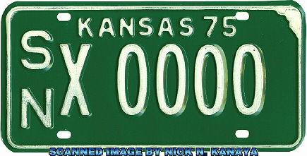 REFERENCE NUMBER: KS-1975-BFIRST YEAR OF ISSUE: 1974 PLATE TYPE: GENERAL ISSUE BASE MATERIAL: ALUMINUM REFLECTORIZATION: NON-REFLECTIVE VALIDATION: NO DECALS USED ON PLATE NOTES: WHITE SERIAL ON GREEN BASE (NO LEGEND BOTTOM)