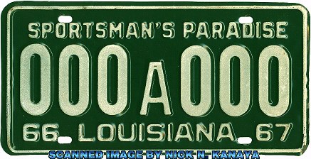 REFERENCE NUMBER: LA-1966FIRST YEAR OF ISSUE: 1966 PLATE TYPE: GENERAL ISSUE BASE MATERIAL: STEEL REFLECTORIZATION: PARTIAL - SERIAL ONLY VALIDATION: NO DECALS USED ON PLATE NOTES: REFLECTIVE WHITE SERIAL ON DARK GREEN BASE