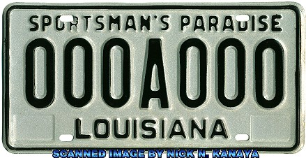 REFERENCE NUMBER: LA-1980NDFIRST YEAR OF ISSUE: 1980 PLATE TYPE: GENERAL ISSUE BASE MATERIAL: ALUMINUM REFLECTORIZATION: PARTIAL - BACKGROUND ONLY VALIDATION: 2 DECALS ON THE PLATE NOTES: BLACK SERIAL ON REFLECTIVE WHITE BASE "SPORTSMAN'S PARADISE" AT THE TOP